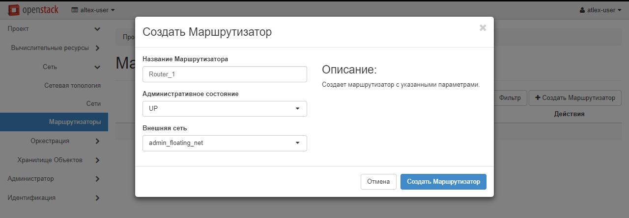 В открывшемся меню задайте название маршрутизатора латинскими буквами, например, Router_1. В выпадающем списке «Внешняя сеть» требуется выбрать значение admin_floating_net. Проверьте, что для административного состояния указано значение UP, и нажмите «Создать маршрутизатор».
