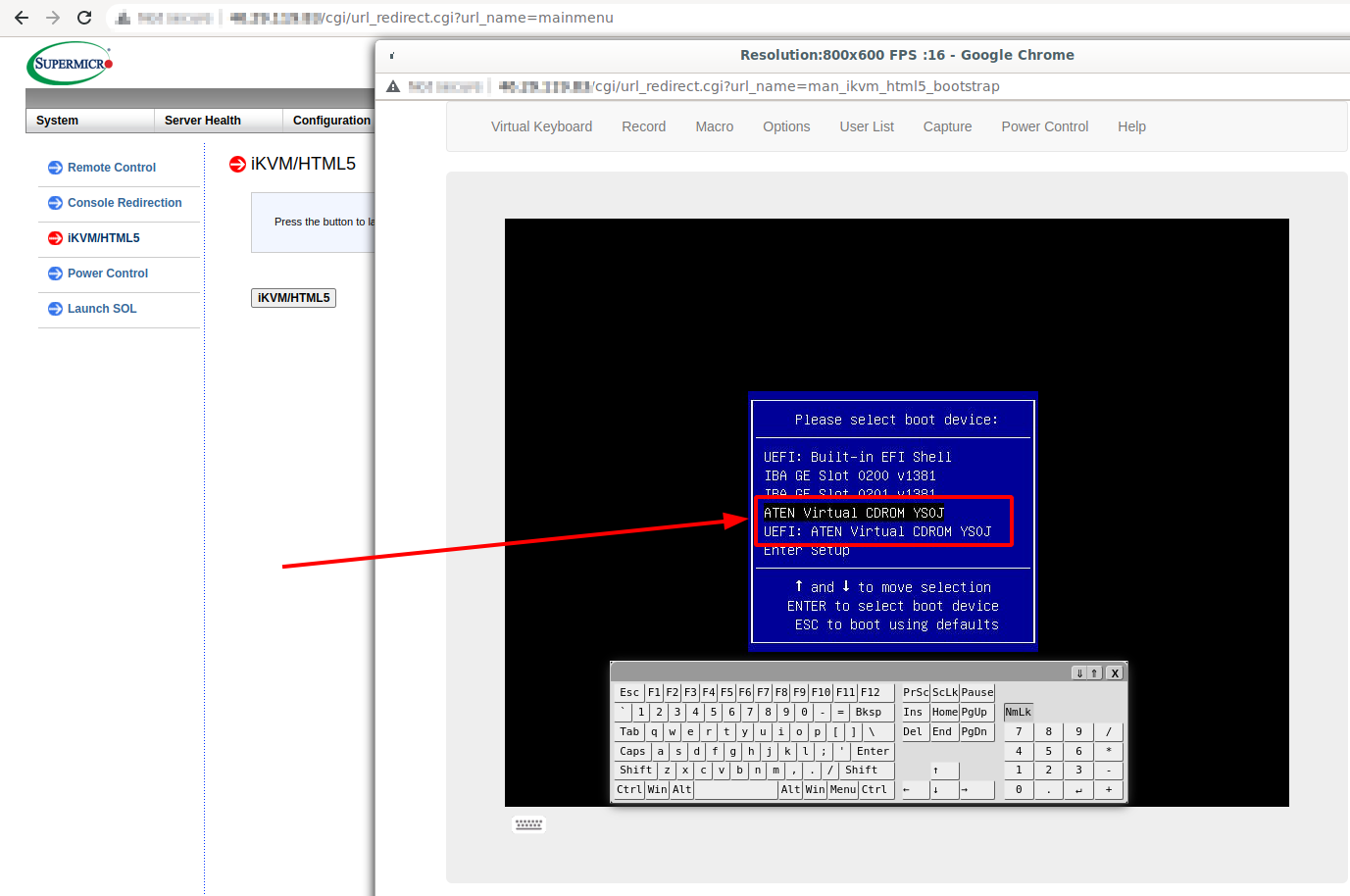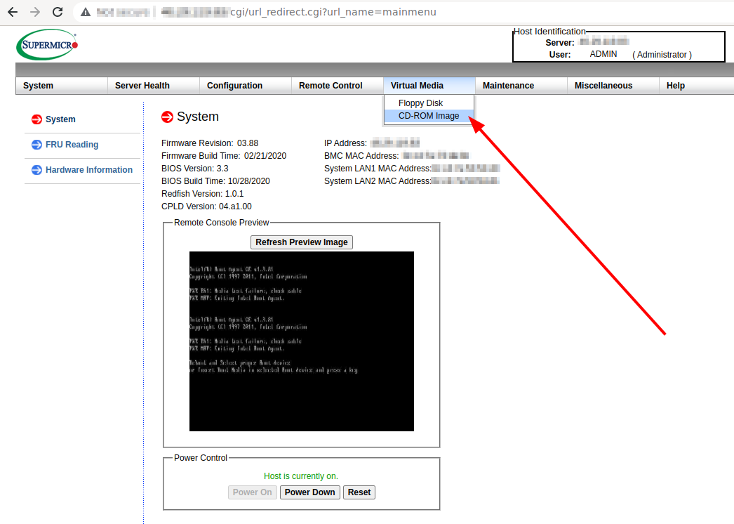 Откройте KVM-консоль с помощью java-апплета, IPMIView или HTML5 (если поддерживается). Подробнее об этом вы можете найти в руководстве «Инструкция по работе с IPMI».