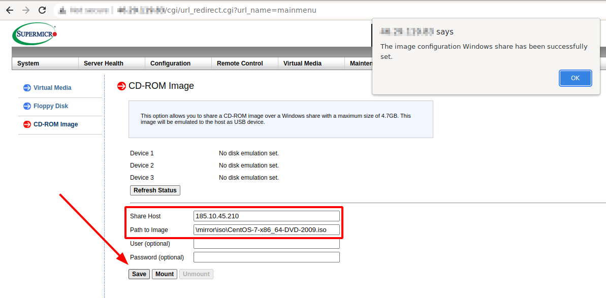 После этого нажмите на кнопку “Mount”, вы получите сообщение: “Please check the device status to confirm whether the image is mounted/unmounted.” Нажмите “ОK” и “Refresh status”.