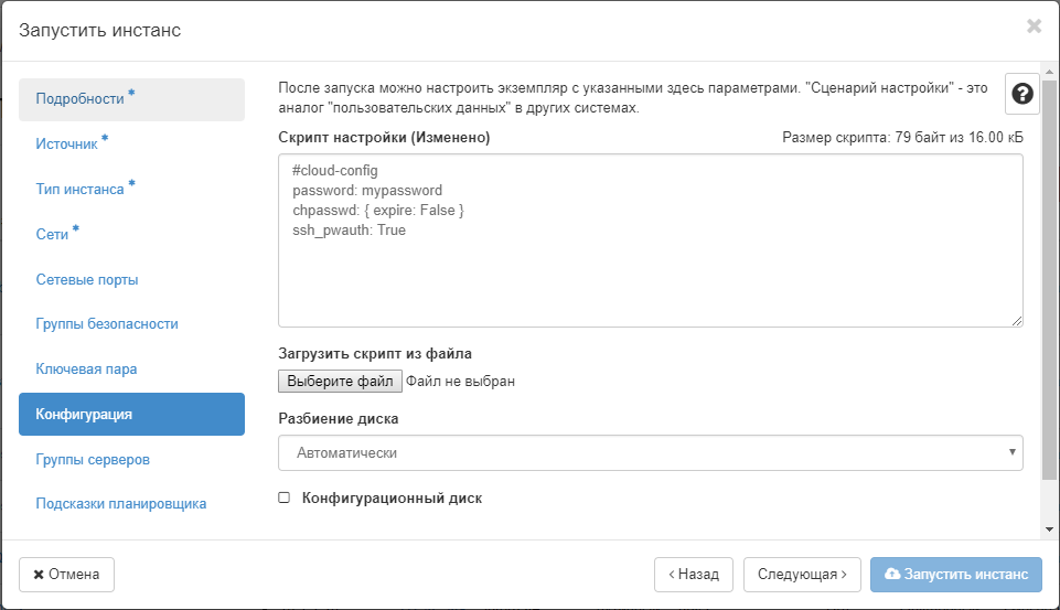 Только для Linux/Unix: Если Вам не требуется организовывать доступ по SSH и вы хотите подключиться к инстансу через «Консоль», вы можете добавить в разделе «Конфигурация» следующий скрипт:
