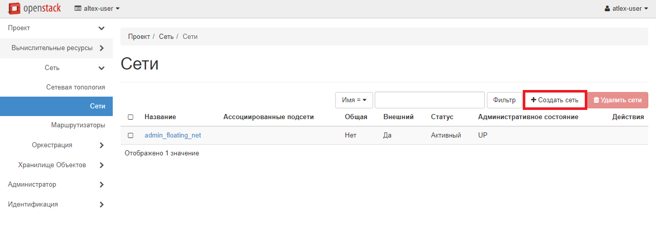После получения реквизитов для доступа к вашему проекту и авторизации в нем первым шагом необходимо произвести настройку сети, в которой будут работать ваши инстансы. Для этого перейдите в раздел «Проект» - «Сеть» - «Сети». На открывшейся странице необходимо нажать «Создать сеть»: