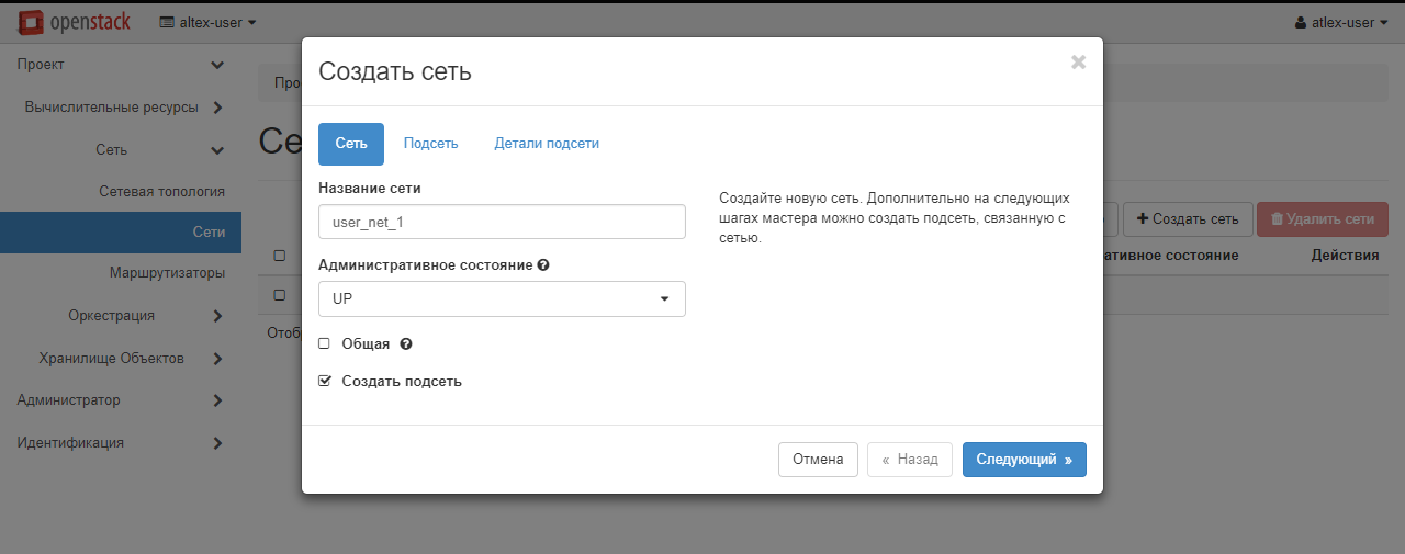 Откроется меню создания сети. Во вкладке «Сеть» в графе «Название сети» укажите любое удобное вам имя. Для примера будет использоваться сеть с названием user_net_1.
