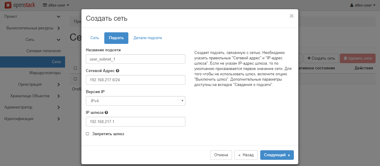 Во вкладке «Подсеть» потребуется создать подсеть для создаваемой сети. Для этого нужно задать «Название подсети». Чтобы избежать путаницы, рекомендуем давать сети и подсети разные названия. Для примера будет использоваться имя user_subnet_1.