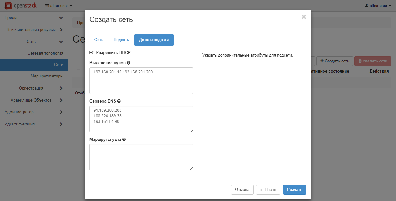 Проверьте правильность введенных значений и перейдите к вкладке «Детали подсети». Разрешите выделение адресов по DHCP и в графе «Выделение пулов» задайте начальное и конечное значение выдаваемых адресов через запятую без пробела. Например, 192.168.201.10,192.168.201.200. В качестве серверов DNS можете использовать наши адреса или любые другие, удобные вам. Значения необходимо вносить по одному адресу на строку.
