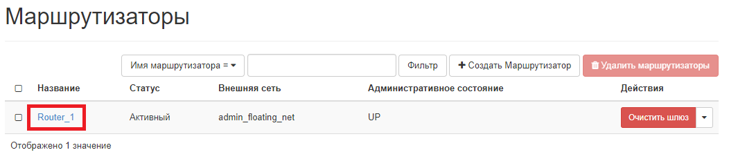 В открывшемся меню задайте название маршрутизатора латинскими буквами, например, Router_1. В выпадающем списке «Внешняя сеть» требуется выбрать значение admin_floating_net. Проверьте, что для административного состояния указано значение UP, и нажмите «Создать маршрутизатор».