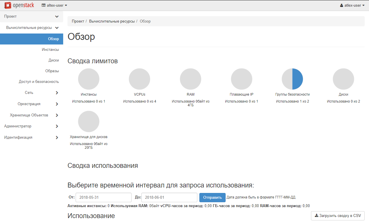 Перед созданием инстанса стоит ознакомиться с доступными ресурсами. Для этого перейдите в раздел «Вычислительные ресурсы» - «Обзор». В «Сводке лимитов» наглядно представлено, сколько ресурсов вы можете использовать в своем проекте.