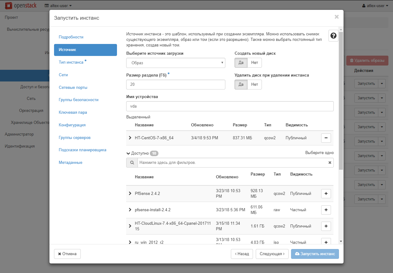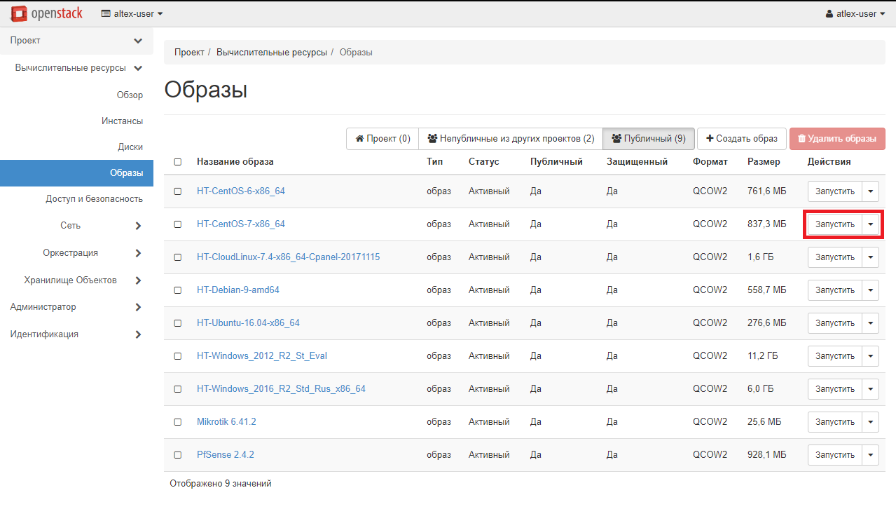 В разделе «Вычислительные ресурсы» - «Инстансы» будут показываться все созданные вами инстансы. Для создания инстанса перейдите в раздел «Вычислительные ресурсы» - «Образы» и выберите пункт «Публичный». В появившемся списке будут отображены все доступные образы, на основе которых вы можете создать свою виртуальную машину. Для этого напротив понравившегося образа нажмите «Запустить». Для примера будет использоваться образ Centos 7.