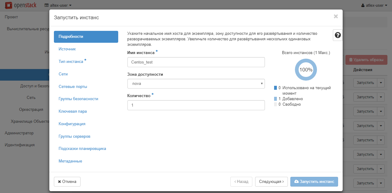 Откроется меню создания инстанса. В поле «Имя инстанса» впишите желаемое имя виртуальной машины, например, Centos_test. Оно будет также использоваться как hostname. При необходимости увеличьте количество создаваемых машин в графе «Количество». При создании нескольких экземпляров им будут присвоены соответствующие индексы.
