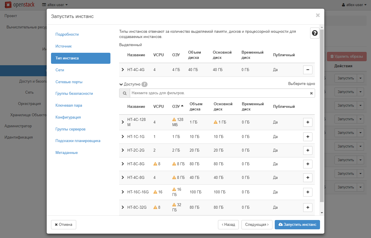 В разделе «Тип инстанса» выберите подходящий вам шаблон, на основе которого будут выданы ресурсы для виртуальной машины. Напротив шаблонов, которые превышают доступные вам ресурсы, будет отображаться восклицательный знак. Выбрать подходящий шаблон можно нажатием иконки «+» напротив него.