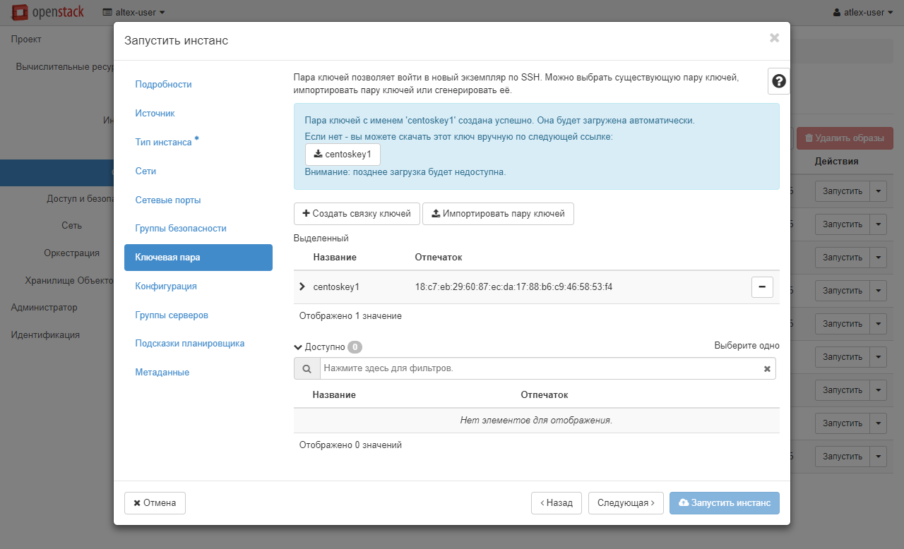При создании машины на основе образа Linux вам необходимо создать ключевую пару в соответствующем разделе. Без этого шага вы в дальнейшем не сможете получить доступ к созданной вами машине. Вы можете импортировать существующую пару или создать новую, нажав соответствующую кнопку. Для создания новой нажмите «Создать связку ключей» и задайте имя латинскими буквами, например, centoskey1. После создания файл с ключом будет автоматически загружен вашим браузером.
