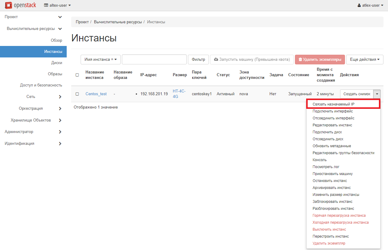 После внесения всех необходимых изменений нажмите кнопку «Запустить инстанс». Созданная виртуальная машина появится в списке инстансов. Подождите несколько мгновений, пока закончится создание инстанса и его статус изменится на «Активный». После этого вы сможете присвоить ему белый IP-адрес. Для этого напротив имени виртуальной машины нажмите на выпадающий список и выберите «Связать назначаемый IP».