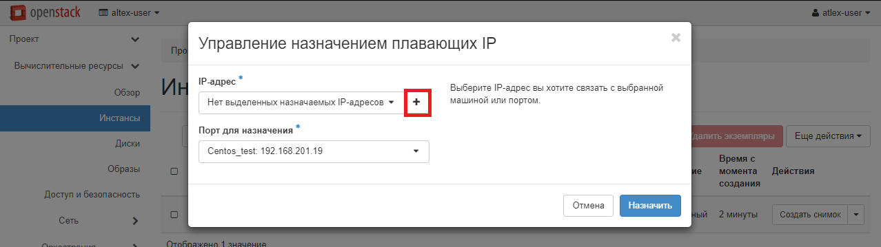 В следующем меню потребуется нажать кнопку «Выделить IP», после чего вы снова вернетесь на предыдущую страницу. Теперь в выпадающем списке «IP-адрес» появится доступный белый IP, который вы сможете присвоить порту вашей виртуальной машины. Для завершения настройки нажмите «Назначить».