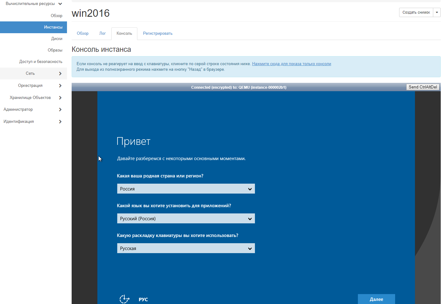 Если вы создавали машину на базе образа Windows, перейдите в раздел «Вычислительные ресурсы» - «Инстансы» и нажмите на имя созданного вами инстанса. На открывшейся странице выберите вкладку «Консоль». В ней вам необходимо будет выполнить первоначальную настройку системы.