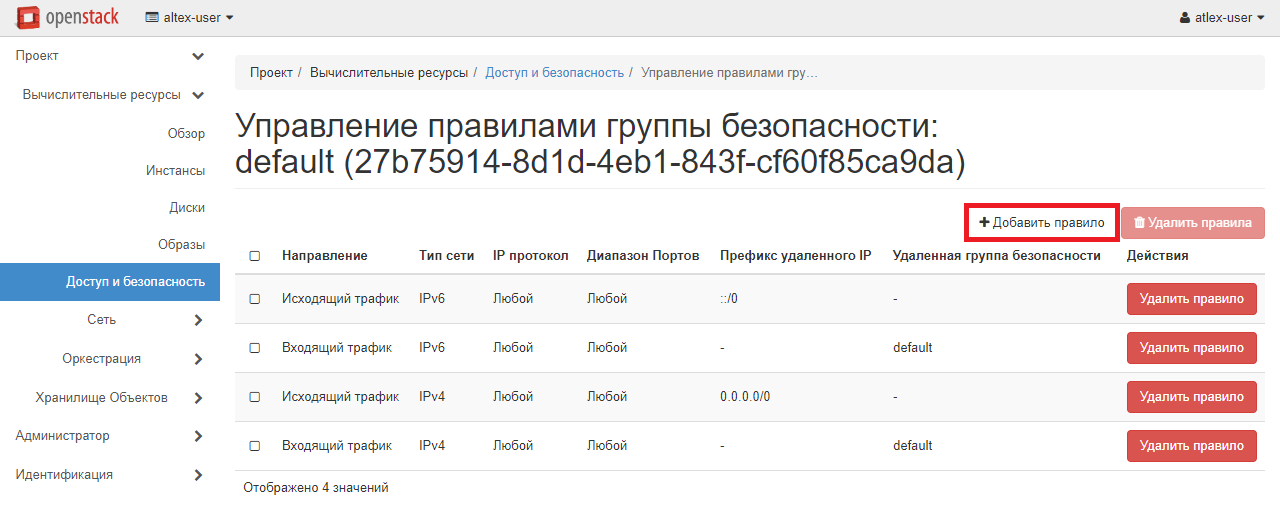 Чтобы получить доступ к созданной виртуальной машине, необходимо изменить правила группы безопасности. Для этого необходимо перейти в раздел «Вычислительные ресурсы» - «Доступ и безопасность». В данном разделе можно как создать новые правила, так и редактировать существующие.
