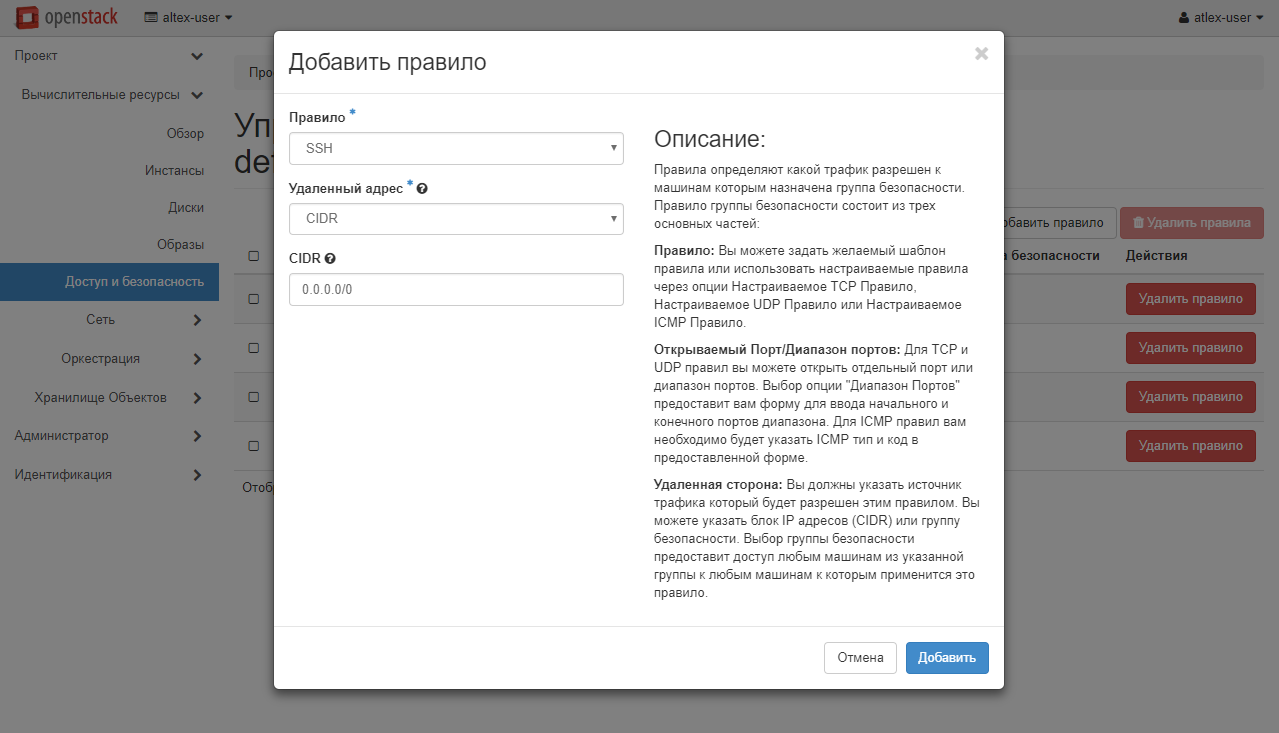 В открывшемся меню в зависимости от созданного инстанса (и требуемого результата) выберите в выпадающем списке «Правило» требуемый параметр (в данном случае, SSH для Linux или RDP для Windows). Остальные значения необходимо менять только при полном осознании проводимых манипуляций. Для сохранения настроек нажмите «Добавить».